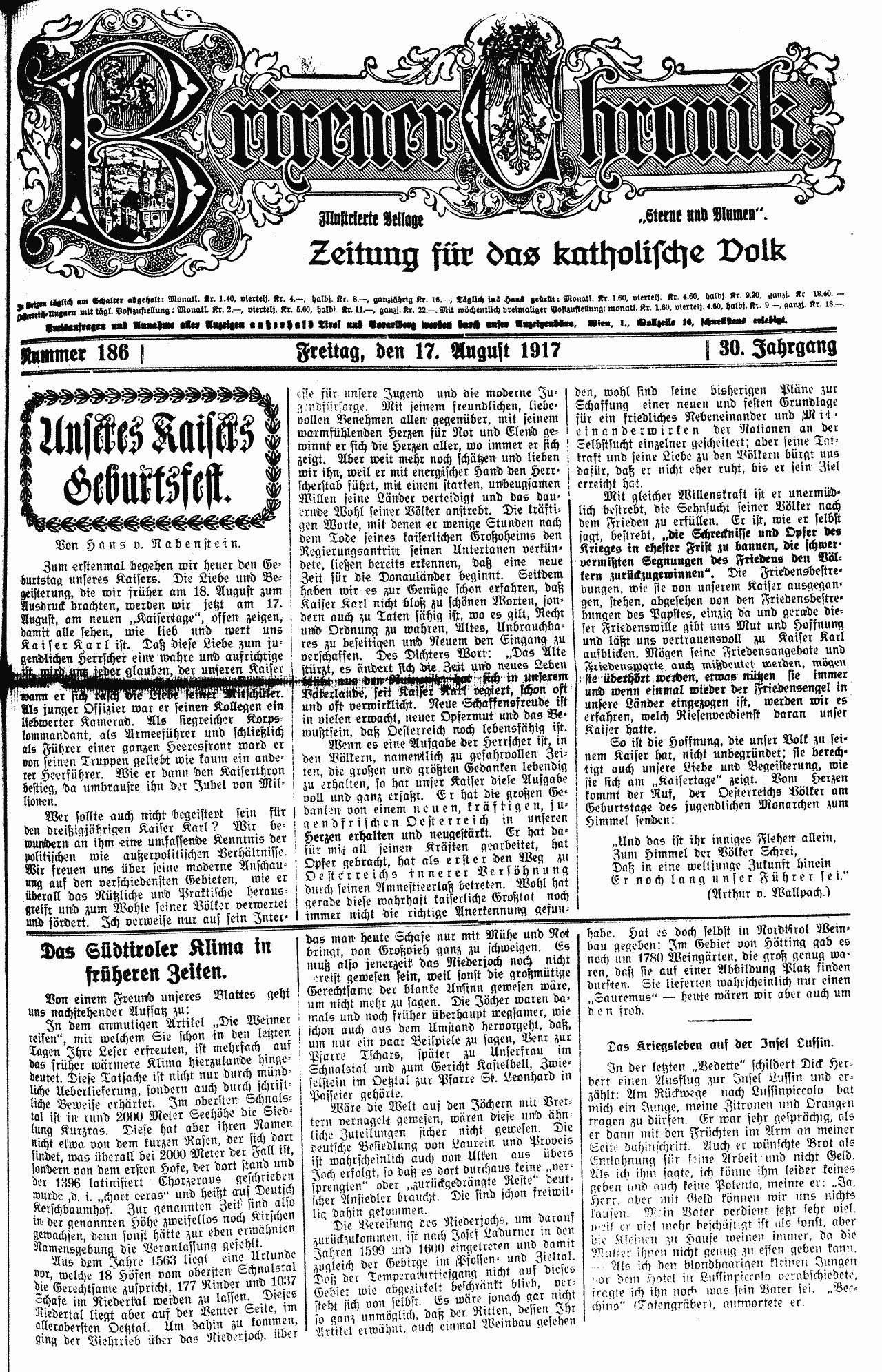 Aus: Brixener Chronik, Zeitung für das katholische Volk, Nummer 186, Freitag den 17. August 1917