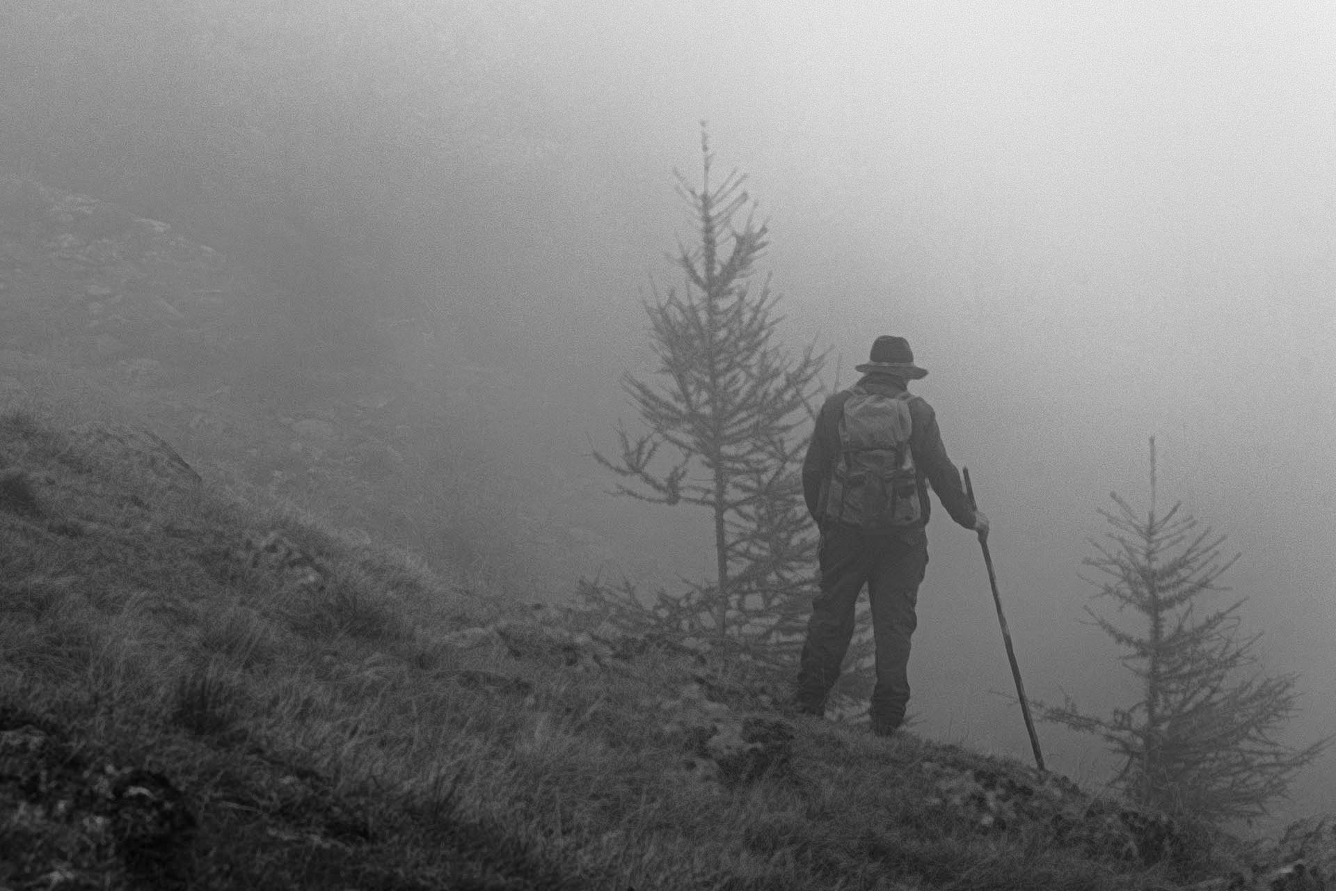 Dann habe ich die Hütte verlassen, bin über die Brücke und hinauf in die Schwärze. Neben dem Bach habe ich den Rucksack abgelegt und dem Hund befohlen daneben zu sitzen. Dann bin ich hinauf. Die Schafe sind oben in zwei Gruppen gestanden. Ich bin hinaufgewatet und habe einen Widder erwischt. Den habe ich auf den Rücken gelegt, bei den hinteren Füßen gepackt und heruntergezogen bis zum Bach. Somit habe ich einen Weg gehab, bin hinauf zu den anderen und habe sie alle über den Bach geleitet.